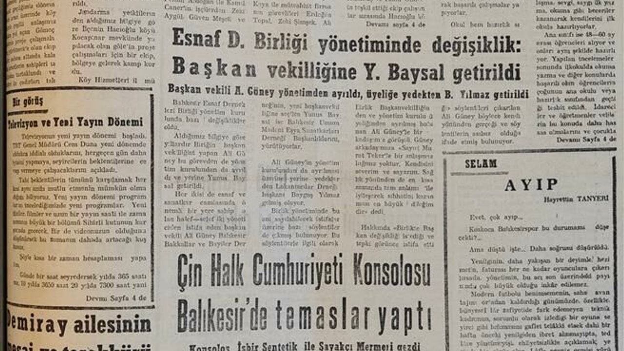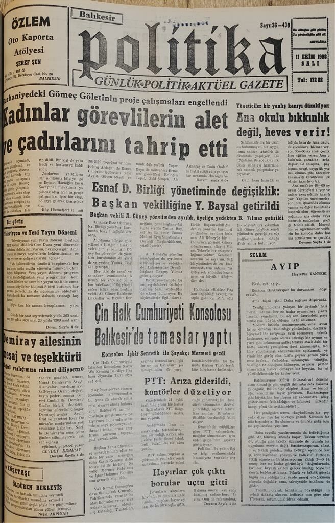 Birinci sayfadaki diğer haber başlıkları şunlar: “Anaokulu bıkkınlık değil heves verir”, “Esnaf Dernekleri Birliği yönetiminde değişiklik: Başkan vekilliğine Yunus Baysal getirildi”, “Çin Halk Cumhuriyeti Konsolosu Balıkesir’de temaslar yaptı”, “PTT: Arıza giderildi kontörler düzeliyor”, “Hayırlar çok çıktı borular uçtu gitti.”