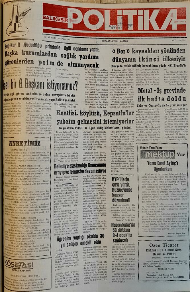 12 Aralık 1988 Pazartesi günü yayımlanan Politika Gazetesi Bor madeni üretimi konusunda ABD’den sonra dünyanın 2’inci ülkesi olduğumuzu manşet haber olarak okurlarına aktarmış. Türkiye’deki ve dünyadaki Bor rezervleri konusunda bilgiler verilmiş. Dünya rezervinin % 40’ınınBigadiçte bulunduğu vurgulanmış.