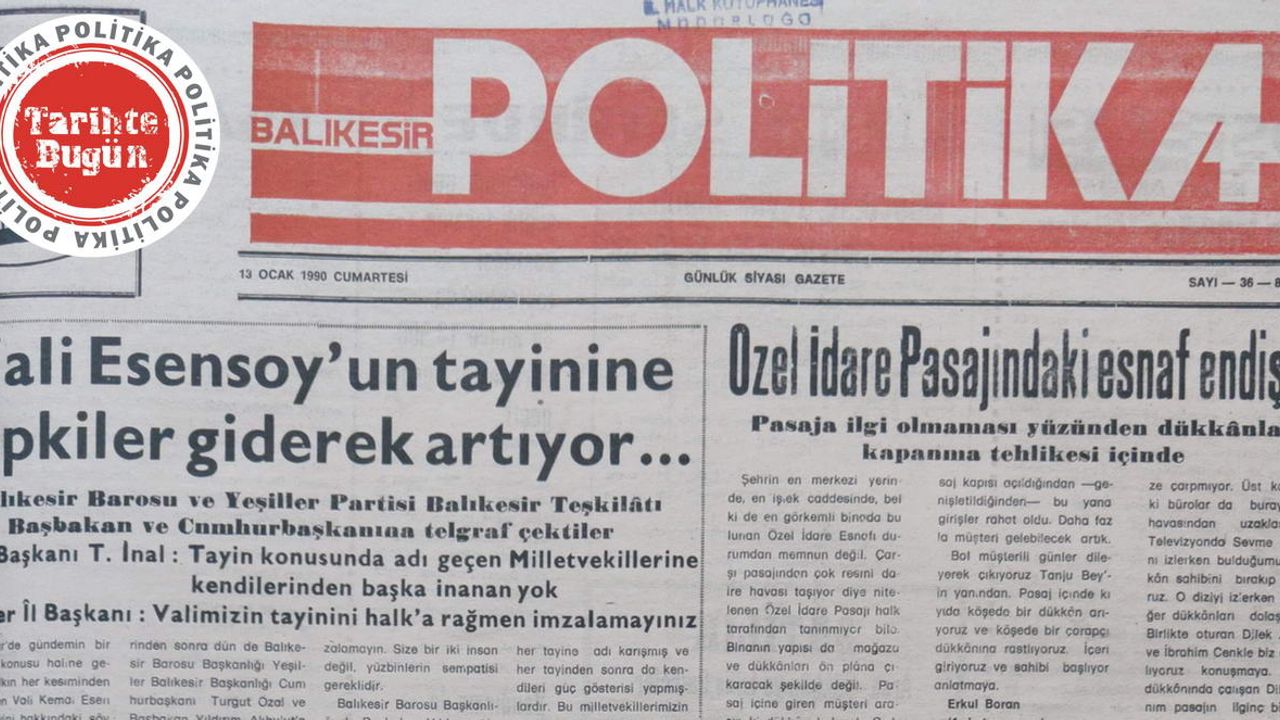 Politika Gazetesi 13 Ocak 1990 Cumartesi günü yayımlanan sayısında Balıkesir Valisi Kemal Esensoy’un atanmasına çeşitli kurum ve kuruluşlardan gelen tepkileri manşet haber olarak okurlarına aktarmış. Haberde, Balıkesir Baro Barosu Başkanı Turgut İnal ve Yeşiller Partisi Balıkesir İl Başkanı Şerafettin Arman’ın Cumhurbaşkanı Turgut Özal ve Başbakan Yıldırım Akbulut’a gönderdiği mesajlar yayımlanmış.