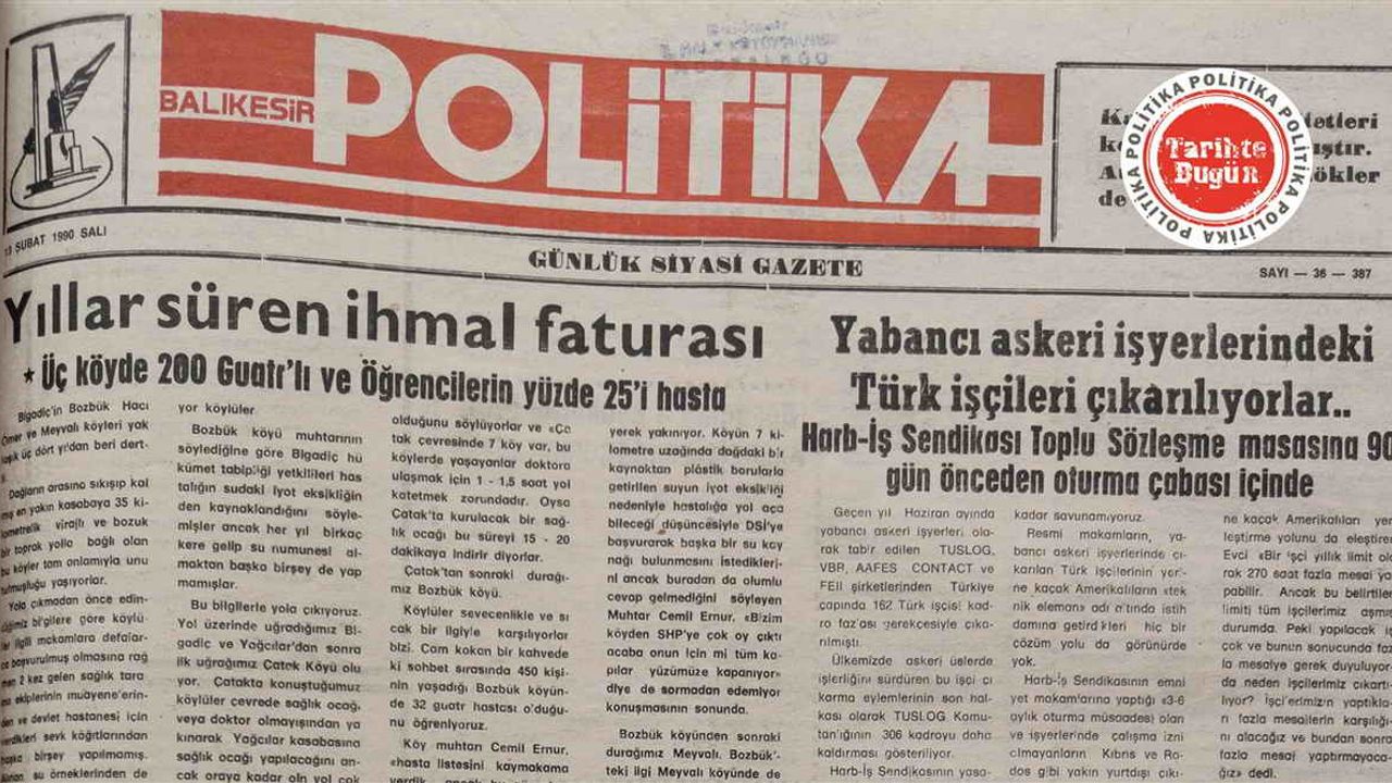 Politika Gazetesi, 13 Şubat 1990 Salı günü yayımlanan sayısında, Bigadiç’in Hacı Ömer, Bozbük ve Meyvalı köylerindeki salgın hale gelen guatr hastalığını konu alan haberi manşetten vererek okurlarıyla paylaşmış. Haberde, Sağlık ekiplerinin köye 2 kez geldiği, devlet hastanesine sevk etmekten başka bir işlem yapmadığı kaydedilirken, guatr hastalığının suyun iyotsuz olmasından kaynaklandığının belirlenmesine rağmen, sularla ilgili bir girişimin olamadığı açıklanmış. Politika’nın bir diğer manşet haberi ise yabancı işyerlerindeki Türk işçilerinin işten çıkarılması konu edilmiş.
