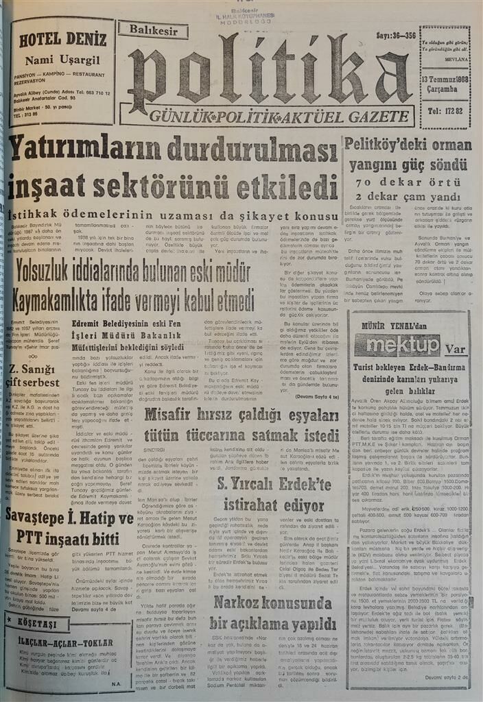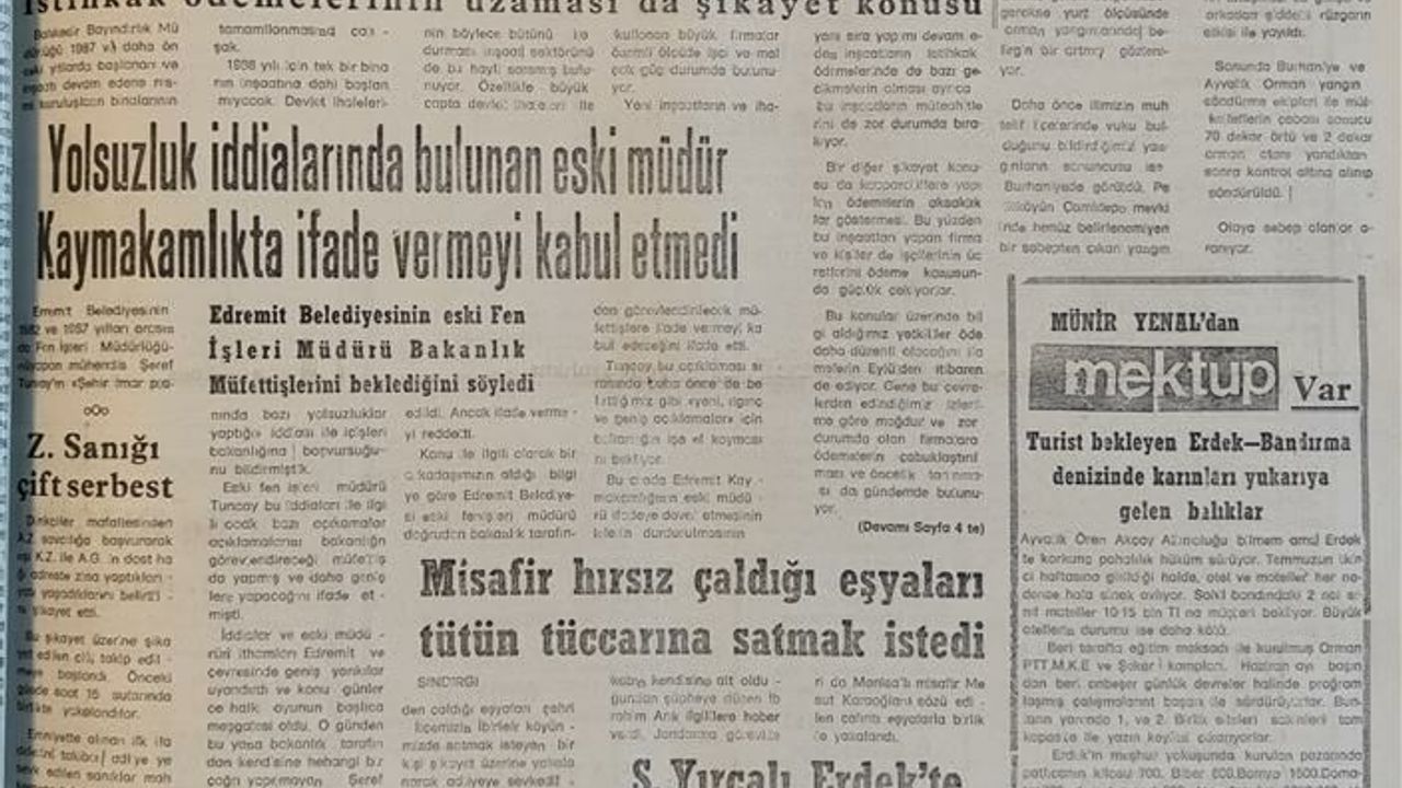 Birinci sayfadaki haber başlıkları: “Pelitköy’deki orman yangını güç söndü”, “Yolsuzluk iddialarında bulunan eski müdür kaymakamlıkta ifade vermeyi kabul etmedi. Edremit Belediyesi’nin eski fen işleri müdürü bakanlık müfettişlerini beklediğini söyledi”, “Misafir hırsız çaldığı eşyaları tütün tüccarına satmak istedi”, “Sırrı Yırcalı Erdek’te istirahat ediyor”, “Savaştepe imam hatip ve PTT inşaatı bitti”, “Narkoz konusunda bir açıklama yapıldı.”