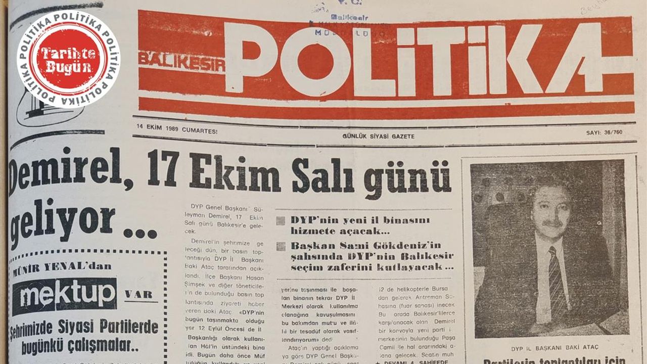 Politika Gazetesi 14 Ekim 1989 Cumartesi günü yayımladığı sayısında, DYP Genel Başkanı Süleyman Demirel’in 17 Ekim 1989 Salı günü Balıkesir’e geleceğini manşet haber olarak vermiş. Haberde, Demirel’in DYP’nin yeni il binasının açılışını yapacağı, Belediye Başkanı Sami Gökdeniz’in şahsında, DYP’nin yerel seçim zaferini kutlayacağı vurgulanıyor.