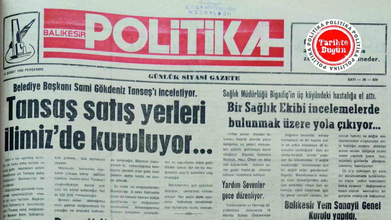 15 Şubat 1990 Perşembe günü neşredilen Politika Gazetesi bu nüshasında, İzmir örneğindeki Tanzim Satış Şirketlerinin (TANSAŞ) Balıkesir’de de kurulacağını belirten haberi manşet yapmış. Haber’de Belediye Başkanı Sami Gökdeniz’in konuyla ilgili araştırmalar yaptırdığı, TANSAŞ’ın yararlarını ve halka neler vereceğini incelediklerini belirtmiş.