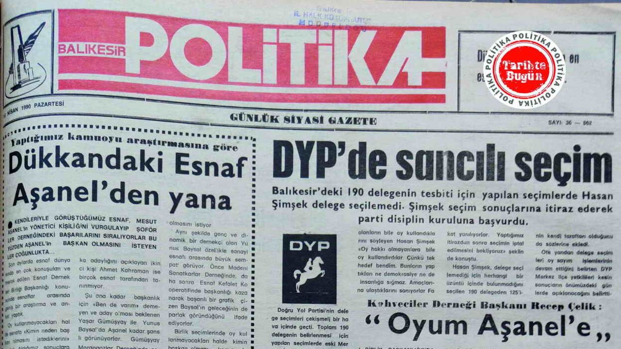 Politika Gazetesi 16 Nisan 1990 Pazartesi günü yayımladığı sayısında, Doğru Yol Partisi Balıkesir örgütünün delege seçimlerini konu edinen haberi manşetten okurlarına duyurmuş. Haberde, DYP Merkez İlçe eski Başkanı Hasan Şimşek’in delege seçilemediğine dikkat çekilmiş.