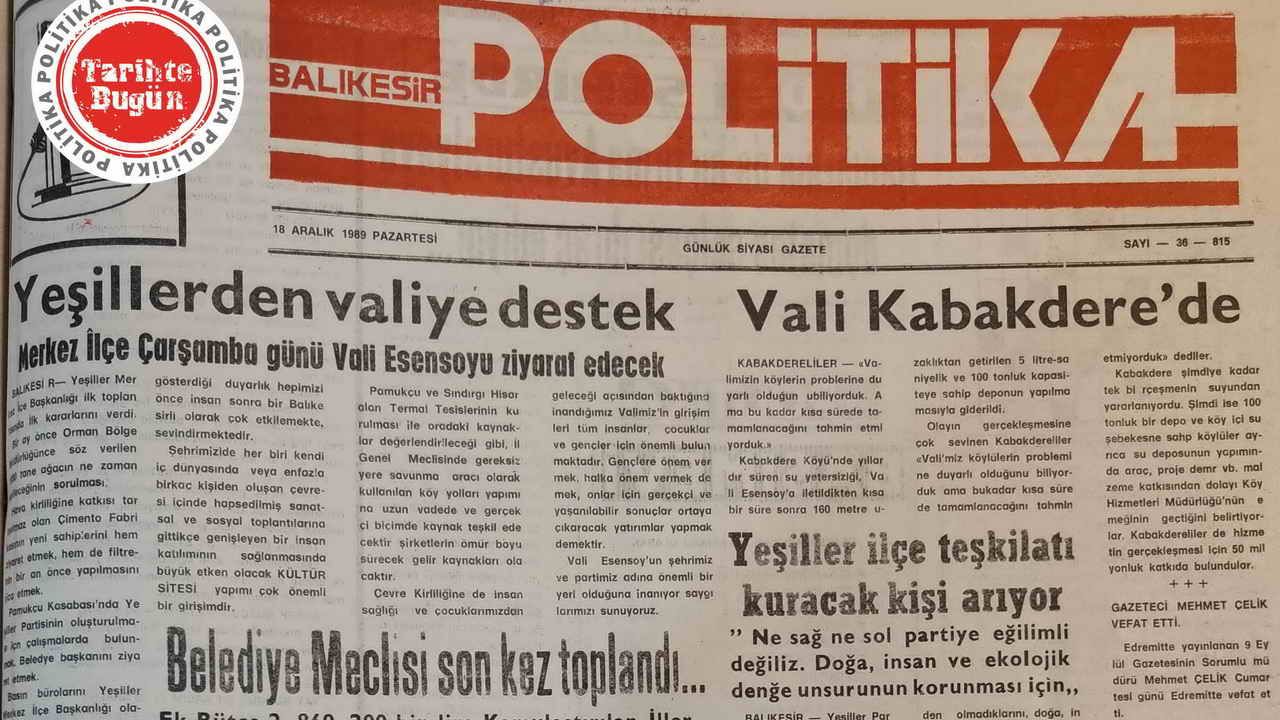 Politika Gazetesi, 18 Aralık 1989 Pazartesi günü yayımlanan sayısında, Balıkesir’de kuruluşunu yeni tamamlayan Balıkesir Yeşiller Partisi Merkez İlçe Başkanlığının ilk toplantıda aldığı kararları ve Balıkesir Valisi Kemal Esensoy’a vereceği desteği açıklayan parti yöneticileriyle ilgili haberi manşetten vererek okurlara konu hakkında bilgiler aktarmış. Haberde, parti yöneticilerinin Vali Esensoy’u ziyaret edeceği vurgulanmış.