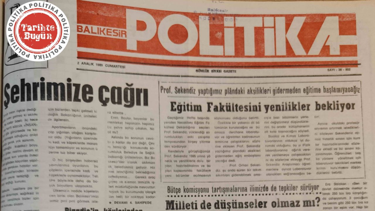 Politika Gazetesi 2 Aralık 1989 Cumartesi günü yayımlanan sayısında Necatibey Eğitim Fakültesine ikinci kez dekan seçilen Prof. Dr. Orhan Sekendiz’in fakültede yapacağı yenilikleri konu alan haberi manşete taşımış. Dekan Sekendiz, 1995 yılına dek yapacağı yenilikleri ve açmayı planladığı yeni bölümler hakkında verdiği bilgileri Politika okurlarına anlatmış. Gazetenin bir diğer manşeti ise “Şehrimize çağrı” başlığını taşıyor.