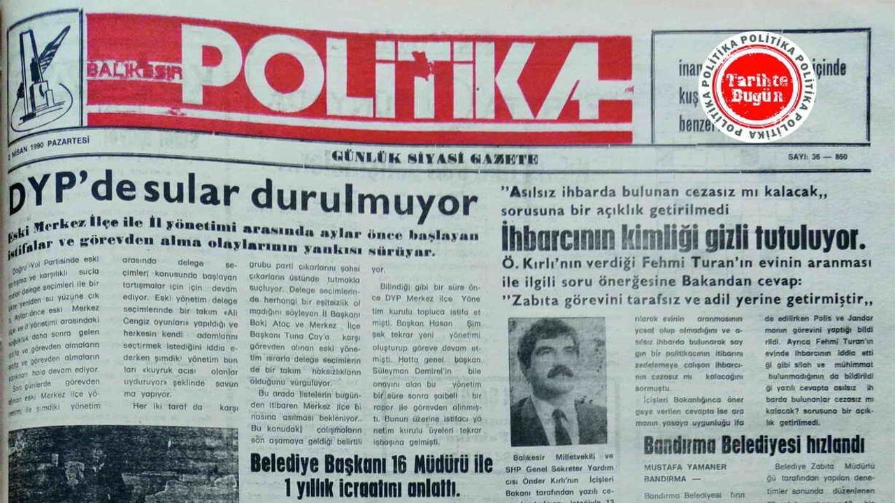 Politika Gazetesi, 2 Nisan 1990 Pazartesi günü yayımladığı sayısında, DYP Merkez İlçe örgütü eski yöneticileri ile İl yönetimi arasında aylar önce meydana gelen tartışmaların, delege seçimleri ile birlikte tekrar başlamasını manşet haber olarak okurlarına duyurmuş. Haberde daha önce istifaların ve görevden almaların getirdiği gerginliğin seçimler ile tekrar başladığına dikkat çekilmiş.