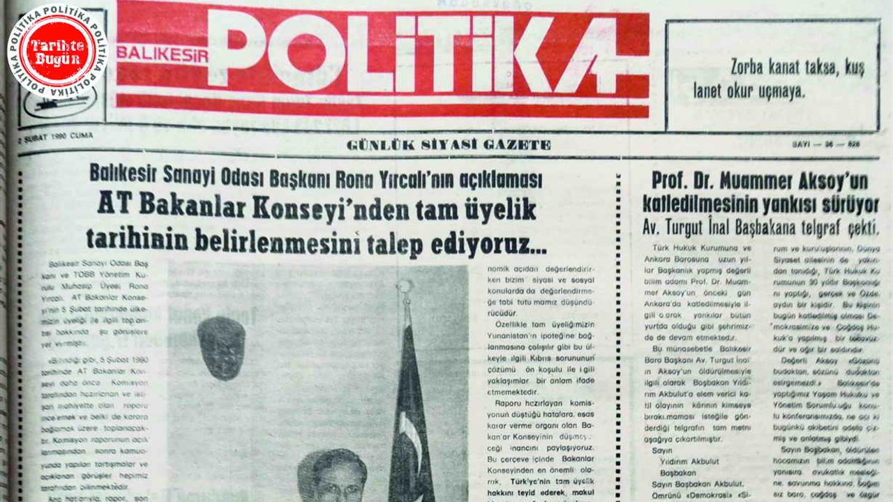 Politika Gazetesi 2 Şubat 1990 Cuma günü yayımlanan sayısında, Balıkesir Sanayi Odası Başkanı Rona Yırcalı’nın düzenlediği basın toplantısını manşet haber olarak vermiş. Yırcalı Basın toplantısında, Avrupa Topluluğu (AT) Bakanlar Konseyinden tam üyelik tarihini belirlemesini beklediklerini açıklamış.