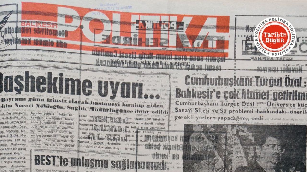 Birinci sayfadaki diğer haber başlıkları: “Cumhurbaşkanı Turgut Özal: ‘Balıkesir’e çok hizmet getirilmeli’”, “BEST’te anlaşma sağlanamadı”, “İzmir-Ayvalık yolunda kaza”, “Özal’ın ziyaretinden notlar”, “Kaldırımlar genişletilsin”, “Ağaç Bayramı kutlanıyor”, “H. Şadi Arabacıoğlu’nu kaybettik”, “Damperle gelen ölüm.”