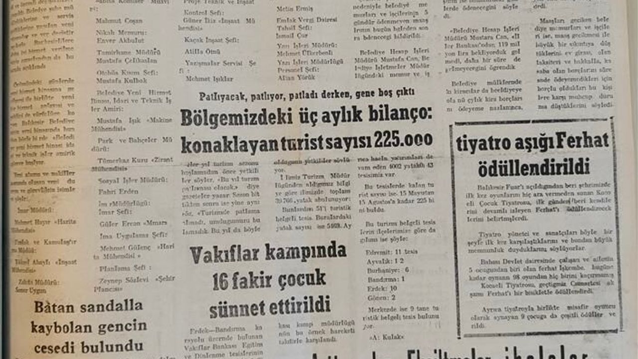 Birinci sayfadaki diğer haber başlıkları: “Bölgemizdeki 3 aylık bilanço: Konaklayan turist sayısı 225.000”, “Vakıflar kampında 16 fakir çocuk sünnet ettirildi”, “Batan sandalla kaybolan gencin cesedi bulundu”, “tiyatro aşığı Ferhat Ödüllendirildi.”