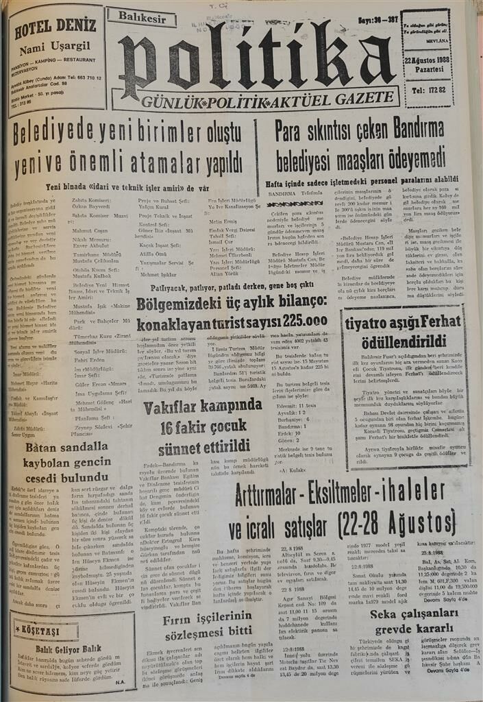 “Belediyede yeni birimler oluştu yeni ve önemli atamalar yapıldı” başlıklı haberde şu bilgiler aktarılmış: “Belediye teşkilatında yeni bir organizasyona gidildi ve önemli değişiklikler yapıldı. Belediye şube müdürlüklerine ve servis şefliklerine yapılan yeni atamalar ve yer değiştirmelerle Balıkesirlilere daha iyi hizmet verilmesinin amaçlandığı açıklandı. Yeni hizmet binasına geçilmesiyle birlikte yeni bir hizmet anlayışını yürürlüğe koyan Balıkesir Belediyesinde yeni hizmet binası için İdari ve teknik işler amirliği birimi göreve başlıyor. Belediyenin gerçekleştirdiği atamalar şöyle: İmar müdürü Mehmet Hayır, Emlak ve Kamulaştırma Müdürü Yüksel Abaylı, Zabıta Müdürü Soner Uygun, Tamirhane Müdürü Mustafa Çelikaslan, Park ve Bahçeler Müdürü Tümerkan Kuzu, Sosyal İşler Müdürü Fahri Erden, Yazı İşleri Müdürü Mehmet Ülkerbenli.”