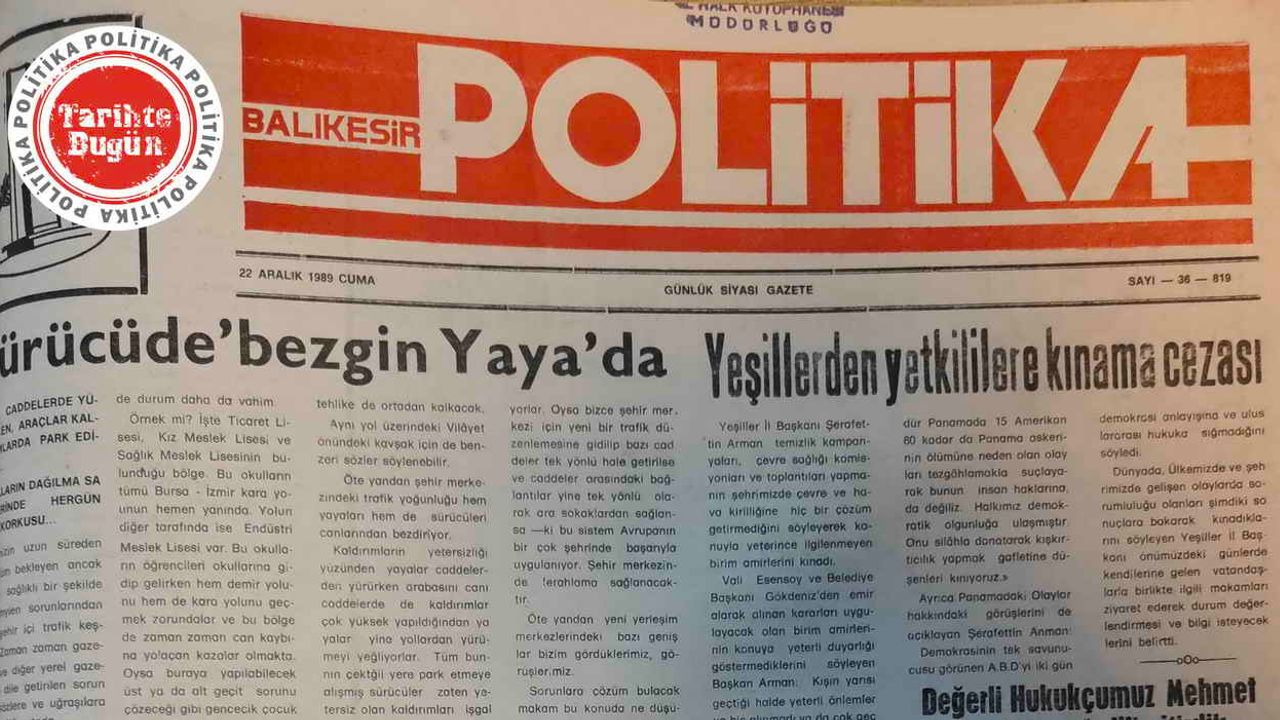 Politika Gazetesi, 22 Aralık 1989 Cuma günü yayımlanan sayısında, Yeşiller Partisi Balıkesir İl Başkanı Şerafettin Arman’ın, Vali Kemal Esensoy ve Belediye Başkanı Sami Gökdeniz’in Çevre ve doğa temizliği konusunda verdiği emirleri dinlemeyen daire müdürlerini kınamasını manşet haber olarak okurlarla paylaşmış.