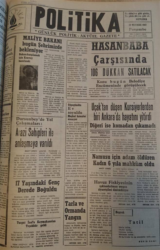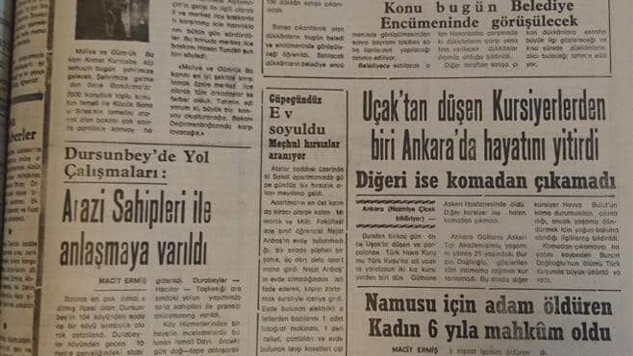 İlginç haberlerden birinin başlığı, “Uçaktan düşen kursiyerlerden biri Ankara’da hayatını yitirdi, biri komadan çıkamadı” diğer haberin başlığı ise “Namusu için adam öldüren kadın 6 yıla mahkum oldu” sözcüklerinden oluşuyor. İlginç haberlerin özeti şöyle: Bundan birkaç gün önce Uşak’ta düşen ve parçalanan Türk Hava Kurumu Türk Kuşu’na ait uçakta yaralanan 2 kız kursiyerden biri dün tedavi gördüğü Gülhane Askeri Hastanesi’nde öldü. Diğer kursiyer is komadan çıkamadı. Gülhane Askeri Tıp Akademisi’nde yaşamını yitiren 21 yaşındaki Burçin Dağlıoğlu gösterilen tüm ihtimama rağmen kurtarılamadı. Diğer Kursiyer Havva Bulut’un koma durumundan çıkmadığı ancak yaşama döndürmek için yoğun bakıma alındığı bildirildi.” “2 yıl önce Kayabey Mahallesi’nde Ömer Öz isimli inşaat işçisini öldüren Asiye Bozbey’in davası dün Balıkesir Ağır Ceza Mahkemesi’nde sonuçlandı. Asiye Bozbey’e 6 yıl hapis cezası verildi”
