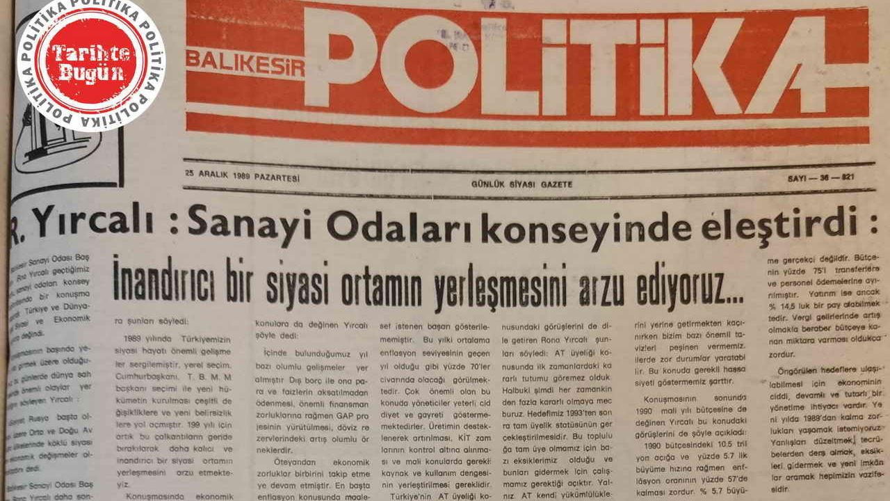 25 Aralık 1985 Pazartesi günü yayımlanan Politika Gazetesi, Balıkesir Sanayi Odası Başkanı Rona Yırcalı’nın Sanayi Odaları Konsey Toplantısında yaptığı konuşmayı sür manşet yaparak okurlarını bu konuda bilgilendirmiş. Haberde, Yırcalı’nın ülkemizde ve dünyadaki gelişmeleri anlatmasını siyasi ve ekonomik istikrar gerektiğinin altını çizmesini okurlarına sunmuş. Birinci sayfada yeni yıl reklam kutlamalarına yer verilmiş.