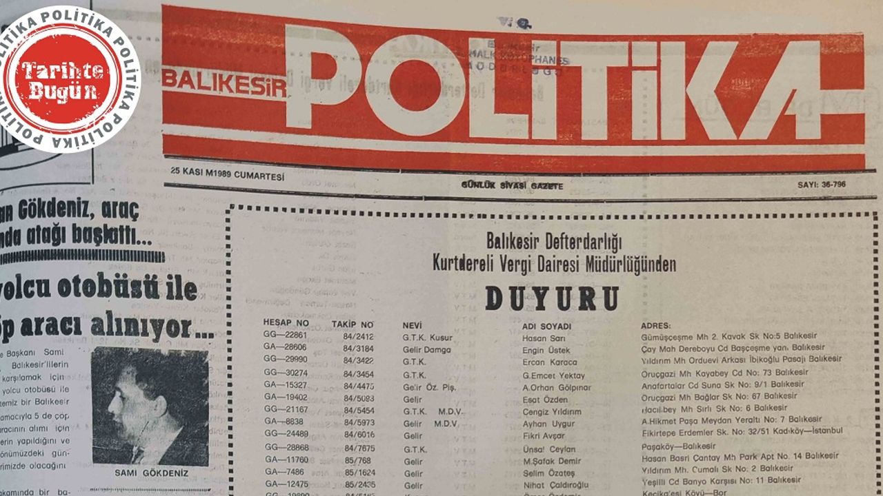 Politika Gazetesi 25 Kasım 1989 Cumartesi günü yayımlanan sayısında, Balıkesir Belediyesi’nin araç filosuna kattığı otobüs ve çöp araçlarının Belediye Başkanı Sami Gökdeniz tarafından duyurulmasını ilk haber olarak okurlarına iletmiş. Gazetenin bu sayısında, birinci sayfanın büyük bir bölümünde Balıkesir Defterdarlığı Kurtdereli vergi Dairesinin verdiği resmi ilan yer almış.