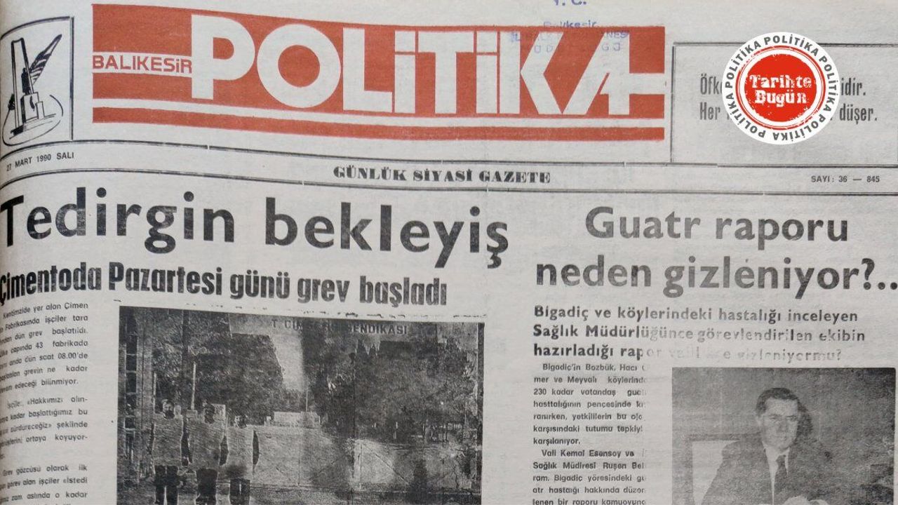 Politika Gazetesi 27 Mart 1990 Salı günü yayımladığı sayısında, “Tedirgin Bekleyiş” başlığı ile çimento fabrikasında pazartesi gün başlayan grevi ve “Guatr raporu neden gizleniyor?” başlığı ile Bigadiç ve çevre köylerdeki Guatr Hastalığı Raporunun gizlendiği haberi manşete taşımış. Sağlık ekibinin hazırladığı raporun valilikçe gizlendiği iddia edilmiş.