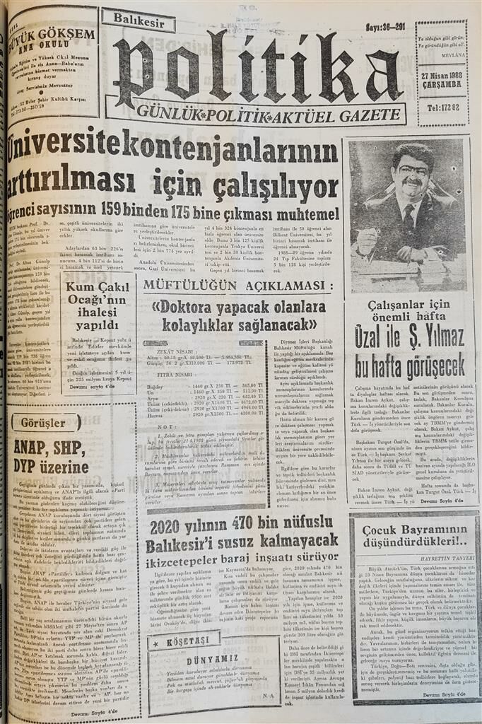 Birinci sayfanın diğer haber başlıkları: “Kum çakıl ocağının ihalesi yapıldı”, “Müftülüğün açıklaması: Doktora yapacaklara kolaylıklar sağlanacak”, “Özal ile Şevket Yılmaz bu hafta görüşecek”, “2020 yılının 470 bin nüfuslu Balıkesir’i susuz kalmayacak”