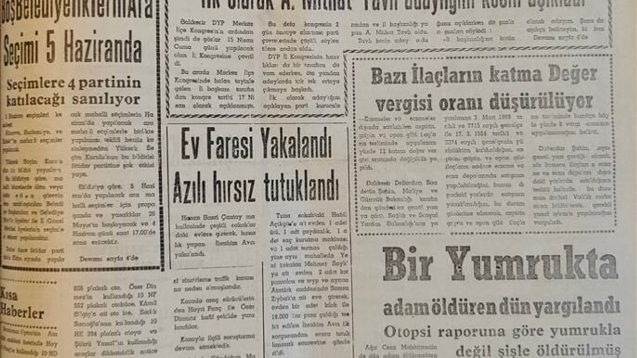 Birinci sayfadaki diğer haber başlıkları şöyle sıralandı: “Beden Terbiyesi Genel Müdürlüğü Resim yarışması düzenledi”, “Boş belediyeliklerin ara seçimi 5 Haziranda”, “Ev faresi yakalandı, azılı hırsız tutuklandı.”, “Bazı ilaçların katma değer vergisi oranı düşürülüyor”, “1 yumrukta adam öldüren dün yargılandı. Otopsi raporuna göre yumrukla değil şişle öldürülmüş.”, “Son zamdan etkilenen taksi şoförleri zam istiyor”, “Böylesi de var”, “Atatürk İlkokulu konseri ilgiyle izlende.”