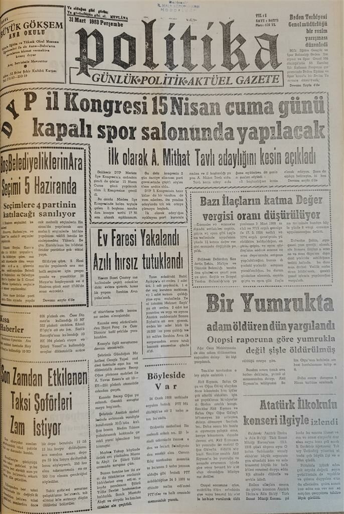 7 sütunu kaplayan başlıkla verilen haberde, “Balıkesir DYP Merkez İlçe kongresinin ardından. Şimdi de gözler 15 Nisan Cuma yapılacak olan il kongresine çevrildi. Bu arada Merkez İlçe kongresinde halen tayinle gelen il başkanı tarafından kongre tarihi 17 Nisan olarak açıklanmıştı. Bu defa kongrenin 2 gün önceye alınması parti çevrelerinde çeşitli söylencelere neden oldu. DYP Genel kurulunun hazırlıkları bir taraftan devam ederken, öte yandan adaylarda tek tek ortaya çıkmaya başladı. İlk olarak adaylığını açıklayan parti kurucularından ve il başkanlığı yapan A. Mithat Tavlı oldu.