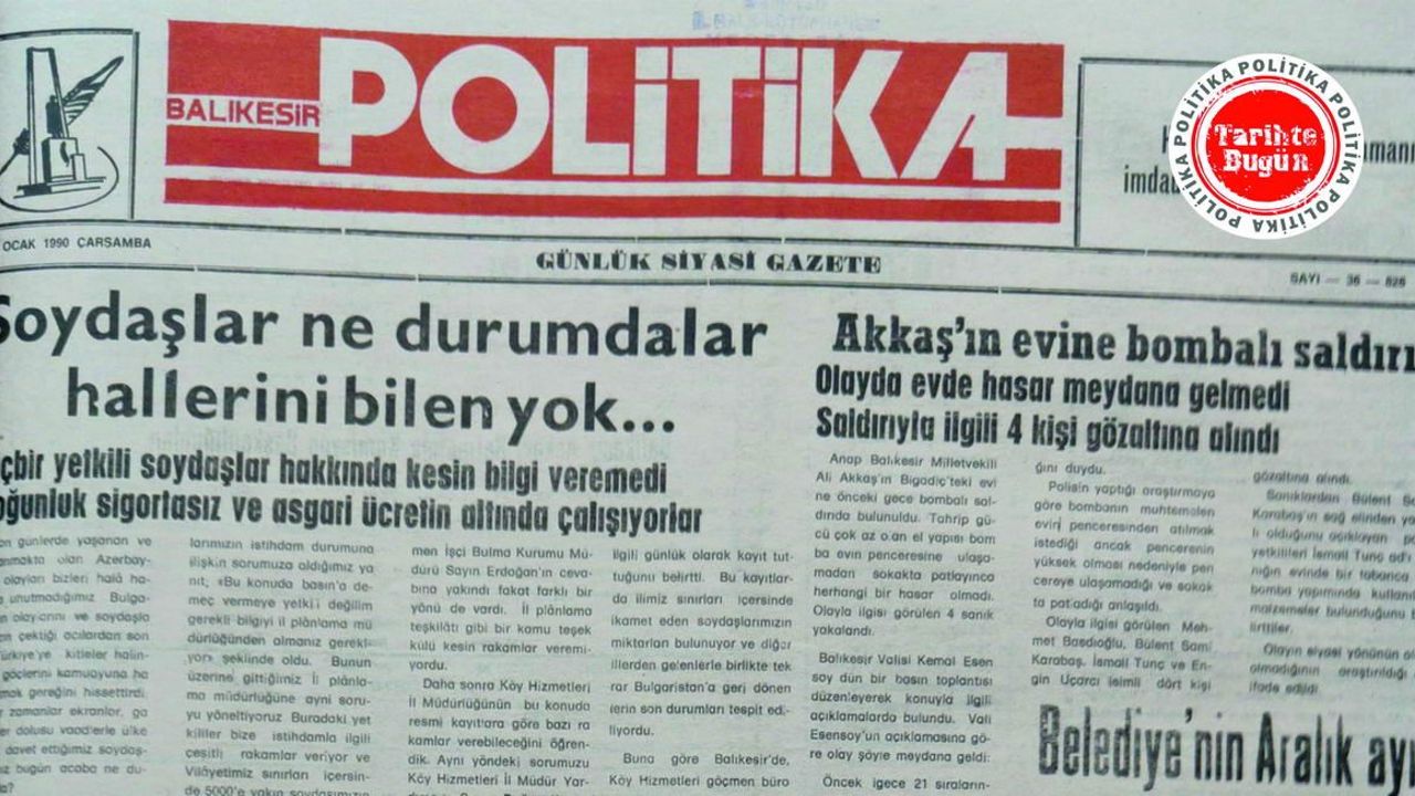 31 Ocak 1990 Çarşamba günü neşredilen Politika Gazetesinin bu nüshasında, ANAP Milletvekili Ali Sami Akkaş’ın evine bombalı saldırı yapıldığı iddiası manşet haber olarak okurlara duyurulmuş. Gazetenin diğer manşet haberiyse, Bulgaristan’dan zorunlu göçe zorlanan soydaşlarımızın durumu ve çektiği sıkıntılar.
