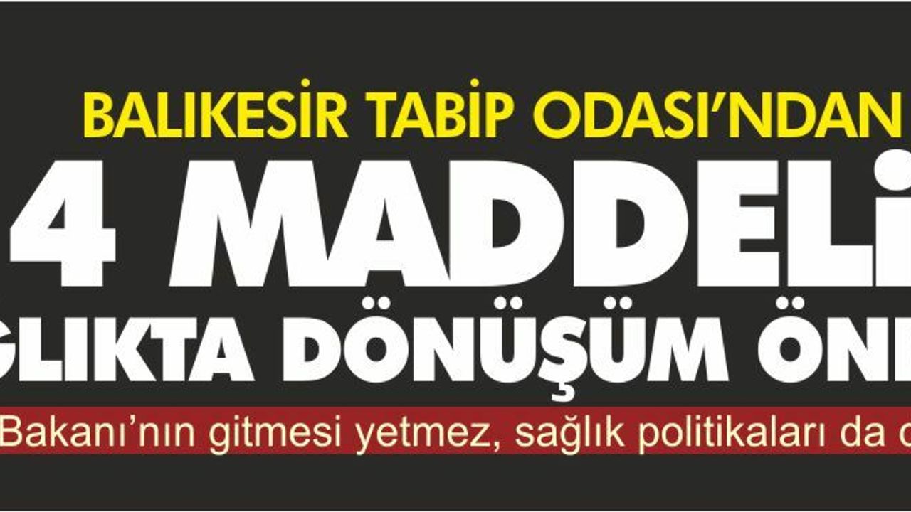 Balıkesir Tabip Odası olarak, yeni sağlık bakanından, hem sağlık hizmeti sunumunun özneleri olan sağlık çalışanları hem de halk için, eşit, nitelikli, erişilebilir, parasız sağlık sistemi için önerilerimiz şunlardır: