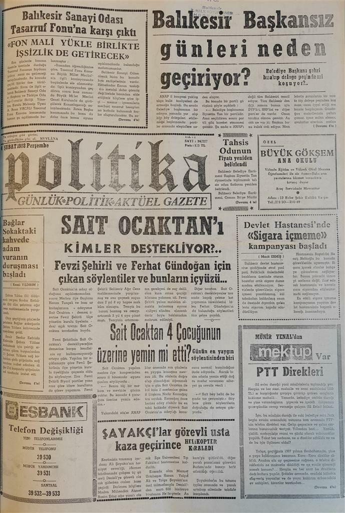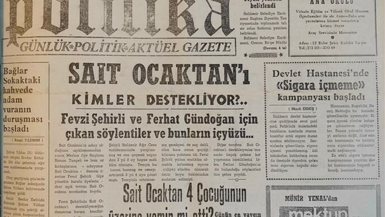 Birinci sayfadaki diğer haber başlıkları şöyle: “ Tahsis odunun fiyatı yeniden belirlendi”, “Bağlar Sokak’taki kahvede adam vuranın duruşması başladı”, “Sait Ocaktan’ı kimler destekliyor”, “Devlet Hastanesi’nde sigara içmeme kampanyası başladı”, “Sait Ocaktan 4 çocuğunun üzerine yemin mi etti?”, “Şayakçılar görevli usta kaza geçirince helikopter kiraladı.”