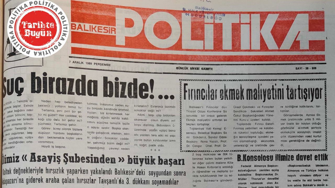 Politika Gazetesi 7 Aralık 1989 Perşembe günü yayımladığı sayısında, “Suç biraz da bizde” başlığı ile çevrenin temiz tutulmamasının nedenini toplumda yaşayanlara bağlayan haberi manşet olarak okurlarıyla paylaşmış. Haberde, temiz bir çevreye sahip olmanın temelinde insan davranışlarının yattığına dikkat çekilmiş.