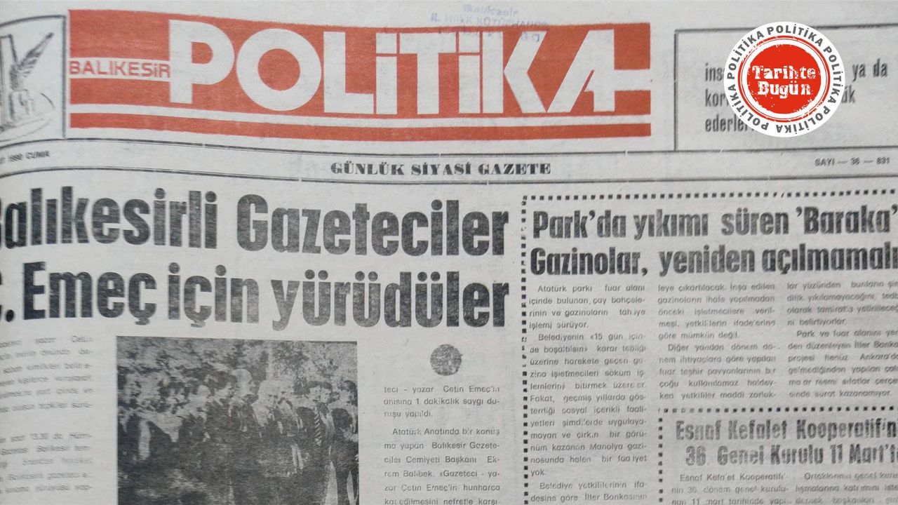 Politika Gazetesi, 9 Mart 1990 Cuma günü yayımlanan sayısında, Balıkesirli gazetecilerin hain bir saldırı sonucu katledilen Çetin Emeç’in katillerinin yakalanması ve adalete teslim edilmesi için yaptığı yürüyüş ve saygı duruşu manşet haber olarak okurlara aktarılmış.