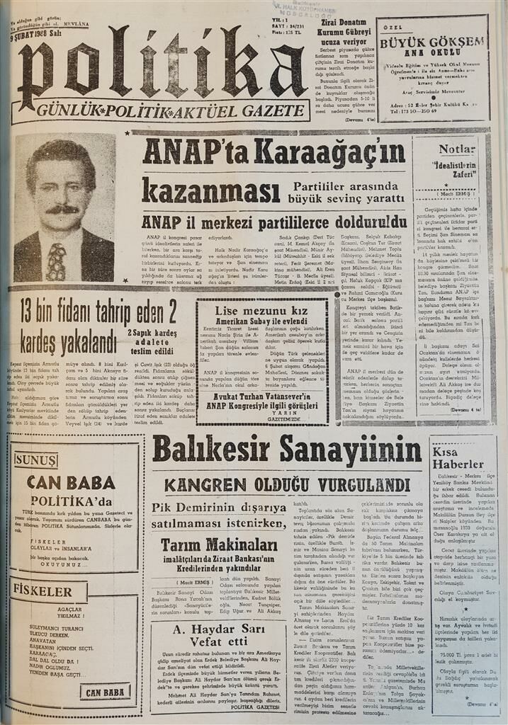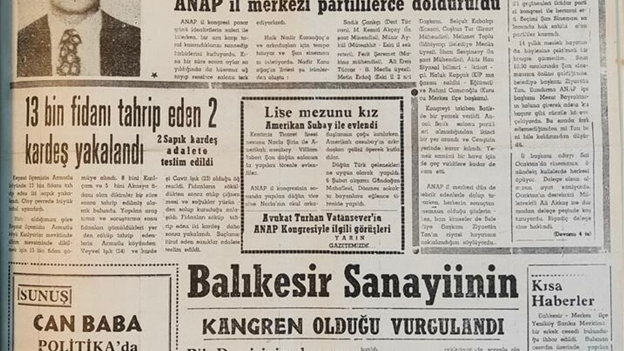 Birinci sayfadaki diğer haber başlıkları: “Zirai Donatım Kurumu gübreyi ucuza veriyor”, “Lise mezunu kız Amerikalı subay ile evlendi”, “Balıkesir Sanayiinin kangren olduğu vurgulandı”, “A. Haydar Sarı vefat etti.”