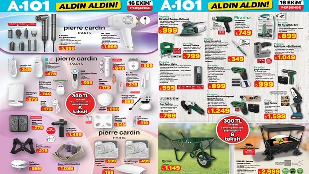 A101 Aldın Aldın 16 Ekim 2025 aktüel kataloğu yayınlandı! Teknoloji, ev ve yaşam ürünlerinde dikkat çeken kampanyalarla dolu bu hafta, özellikle epilasyon cihazı, oyuncu masası, dijital bateri seti, 88 tuşlu piyano ve 3 musluklu su sebili gibi ürünler öne çıkıyor. A101 marketlerin yanı sıra A101’in online alışveriş platformundan da kolayca temin edilebilecek indirimli ürünler, kaçırılmayacak fırsatlar sunuyor.