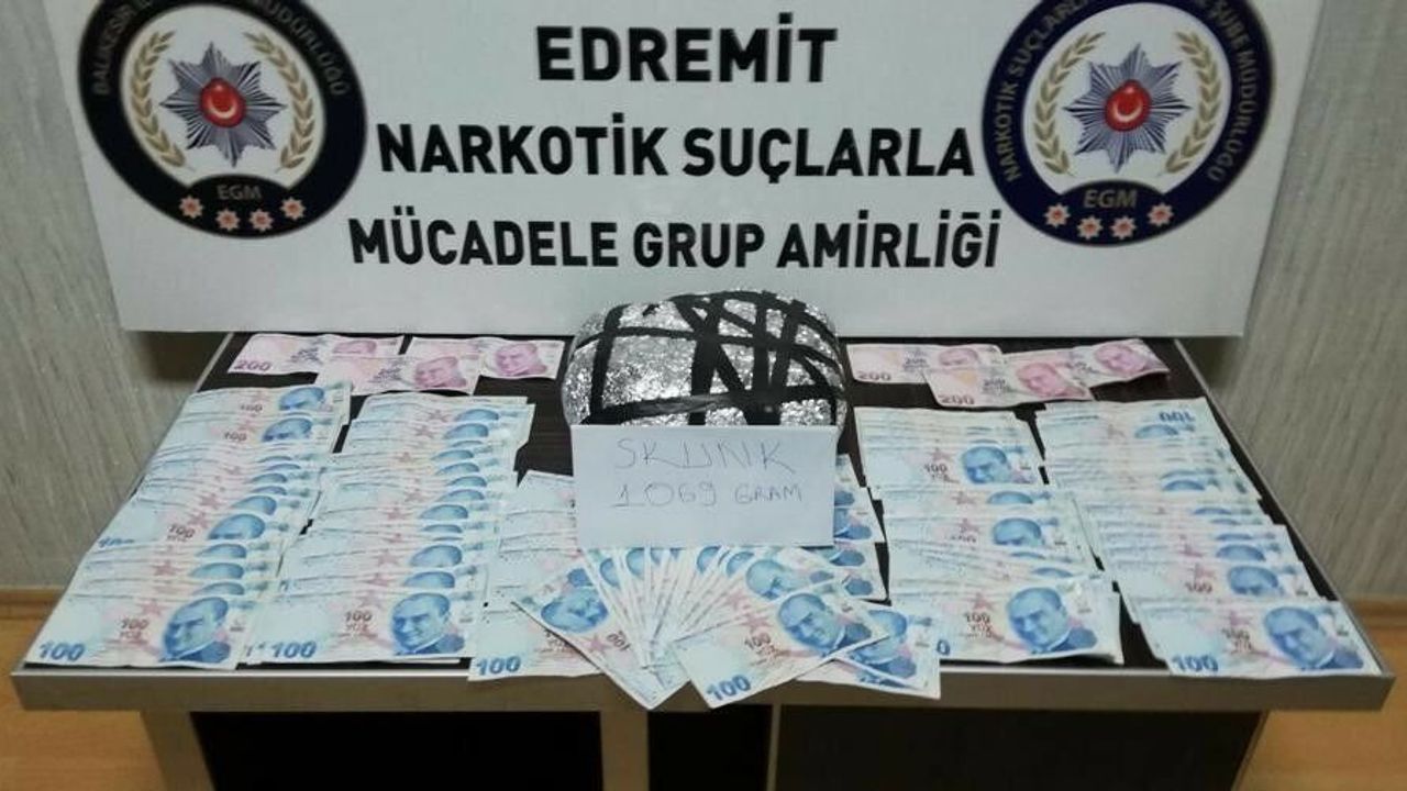Balıkesir Narkotik Suçlarla Mücadele Şube Müdürlüğü uyuşturucu tacirlerine göz açtırmıyor. Edremit ilçesi Akçay Mahallesi'nde yapılan uygulamada D.M., Ö.A. ve S.H.'nin şüpheli tavırları polislerin gözünden kaçmadı. Şüphelilerin üzerinde yapılan aramada alüminyum folyoya sarılı vaziyette 1 kilo 69 gram skunk ile 15 bin lira ele geçirildi.