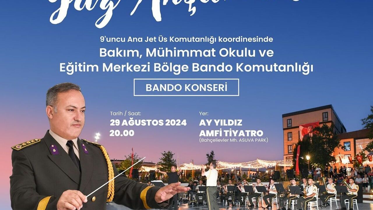 29 Ağustos 2024 Perşembe günü, 9. Ana Jet Üs Komutanlığı'nın koordinesinde düzenlenen Bando Konseri ile Ay Yıldız Amfi Tiyatro’da müzikseverlerle buluşulacak.