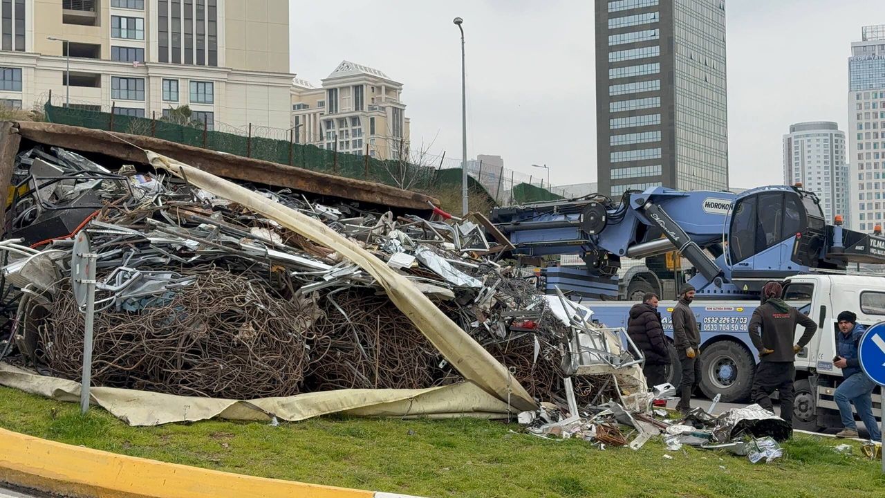 İstanbul Ataşehir’de virajı alamayarak devrilen hurda yüklü kamyon, bölgede trafik yoğunluğuna neden oldu.