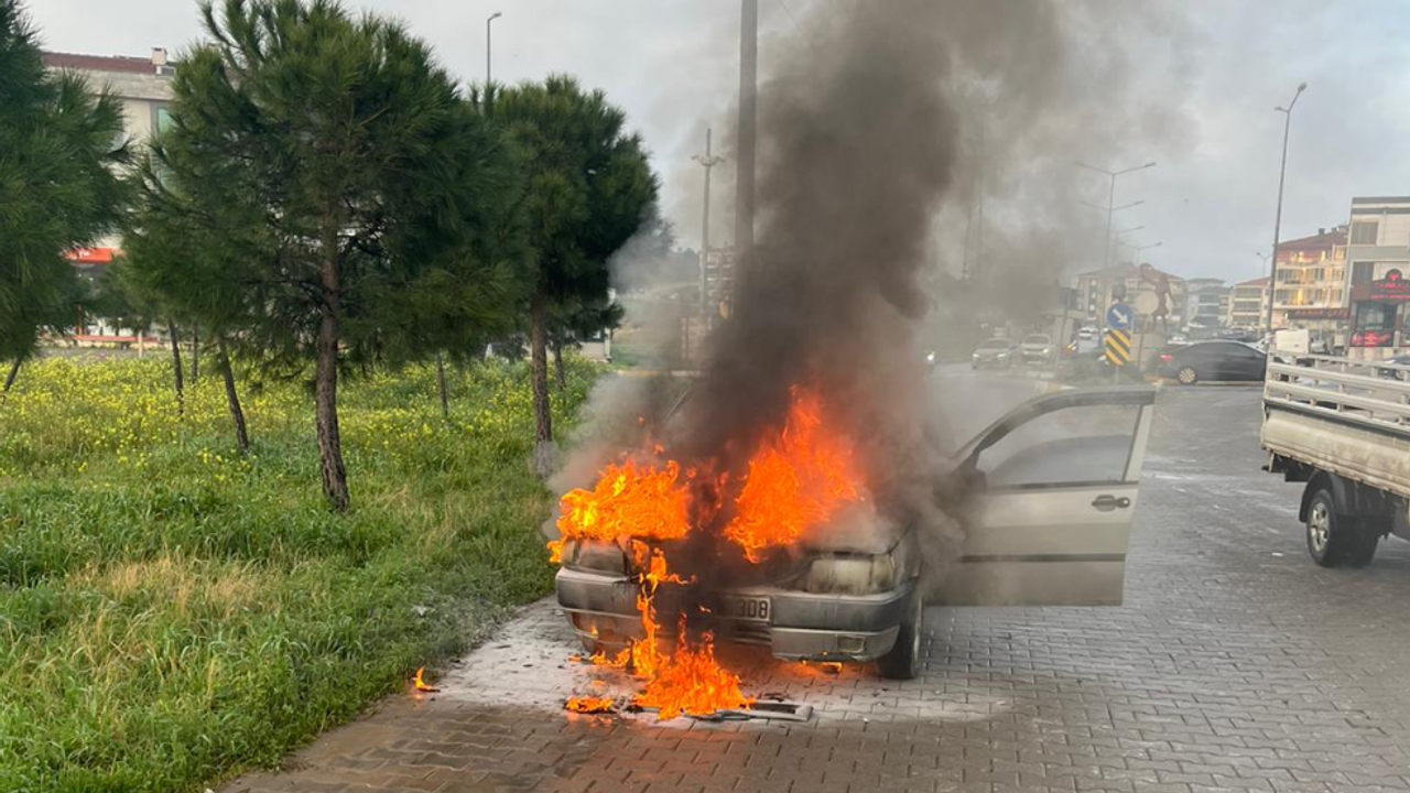 Durumu fark eden sürücü aracı sağa çekerek dışarı çıkarken, alevler saniyeler içinde otomobili teslim aldı.