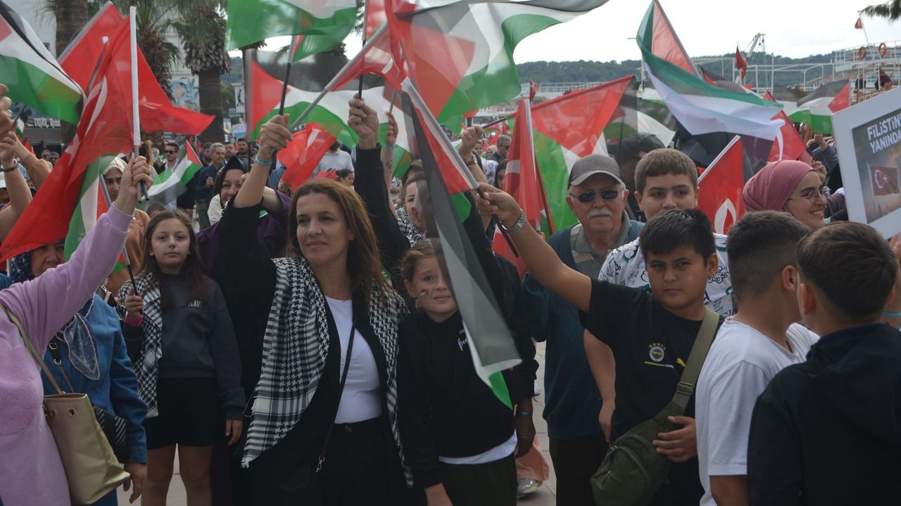 Ayvalık İlçe Emniyet Müdürlüğü’nün aldığı güvenlik önlemleri eşliğinde gerçekleşen yürüyüşte yaklaşık 1000 kişi zaman zaman İsrail aleyhine sloganlar attı.