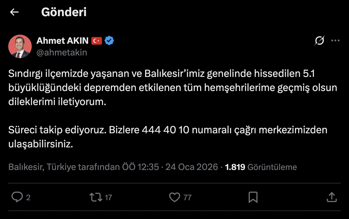 Balıkesir Büyükşehir Belediye Başkanı Ahmet Akın, Sındırgı merkezli meydana gelen ve şehir genelinde büyük korku yaratan depremin ardından vakit kaybetmeden bir açıklama yayımladı.