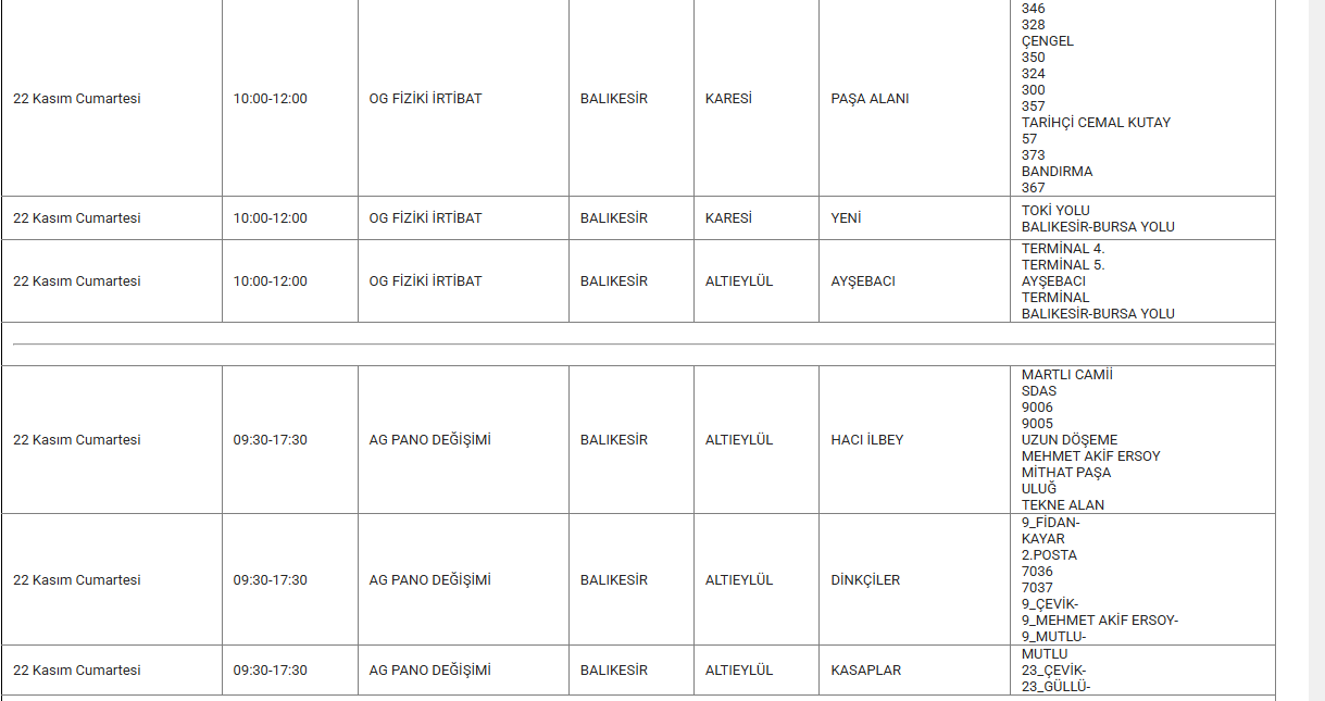 Kesintiler OG fiziki irtibat ve AG pano değişimi çalışmaları kapsamında gerçekleştirilecek.