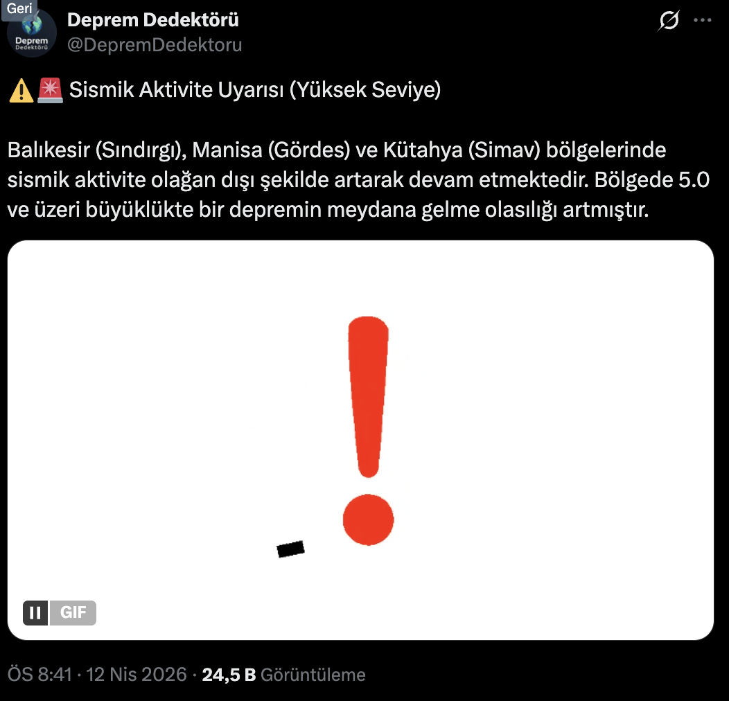 Sismoloji merkezlerinden aktarılan son bilgilere göre; Balıkesir (Sındırgı), Manisa (Gördes) ve Kütahya (Simav) bölgelerini kapsayan hatta sismik aktivite normal seyrin dışına çıktı. Uzmanlar, bölgedeki enerji birikiminin arttığına dikkat çekerek, kısa süre içerisinde 5.0 ve üzeri büyüklükte bir depremin meydana gelme olasılığının ciddi oranda yükseldiğini bildirdi.