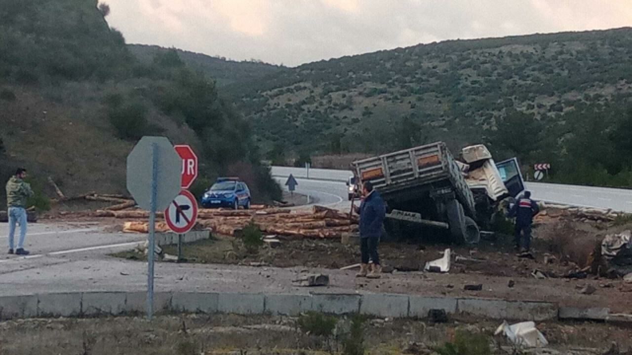 Refüje çarparak duran tırdaki tomruklar kara yoluna saçıldı. AA