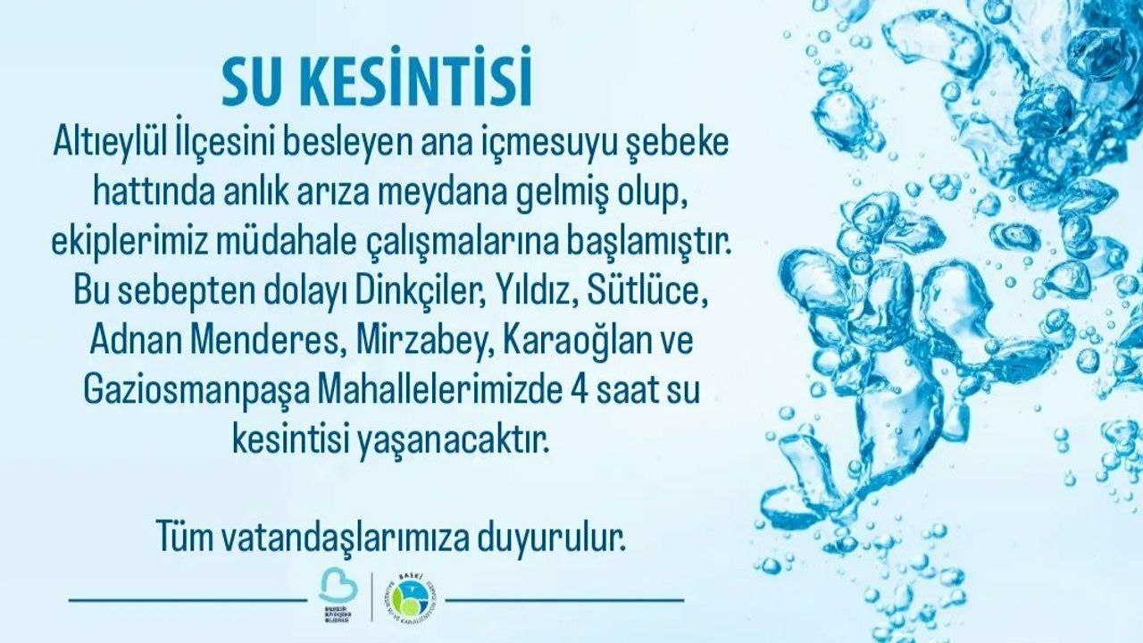 Bu sebeple, Dinkçiler, Yıldız, Sütlüce, Adnan Menderes, Mirzabey, Karaağlan ve Gaziosmanpaşa mahallelerinde dört saat süreyle su kesintisi yaşanacak.