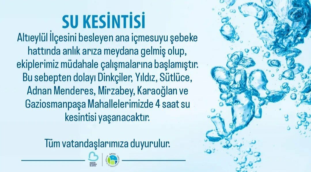 BASKİ, Altıeylül ilçesini besleyen ana içmesuyu şebeke hattında meydana gelen ani arıza nedeniyle, müdahale çalışmalarına başladı.