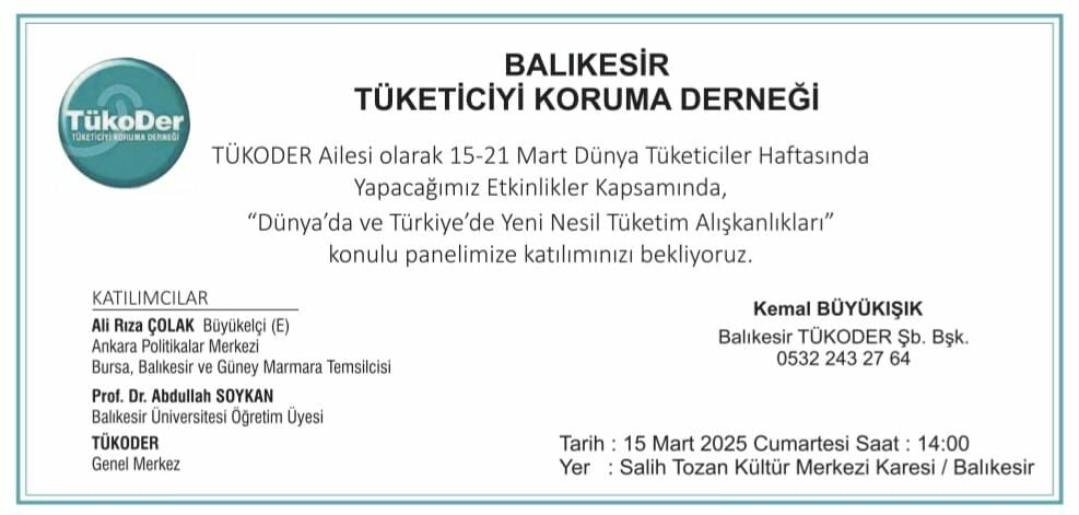 Balıkesir Tüketiciyi Koruma Derneği (TÜKODER), 15-21 Mart Dünya Tüketiciler Haftası kapsamında önemli bir panele ev sahipliği yapmaya hazırlanıyor.