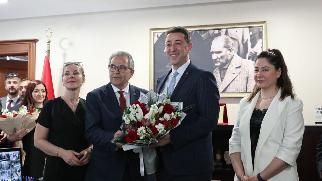 Bandırma Belediyesi'nde gerçekleştirilen "Devir Teslim Töreni"nde, 5 yıllık görev süresini tamamlayan Belediye Başkanı Av. Tolga Tosun, seçimlerde başarılı olan ve kendisinden görevi devralan Dursun Mirza'ya belediye başkanlığı görevini teslim etti.