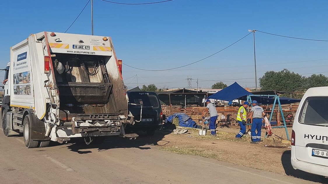 Bandırma Belediyesi Temizlik İşleri Müdürlüğü ekipleri, Kurban Bayramı'nın ardından pazar yerlerinde temizlik çalışmalarını sürdürüyor.