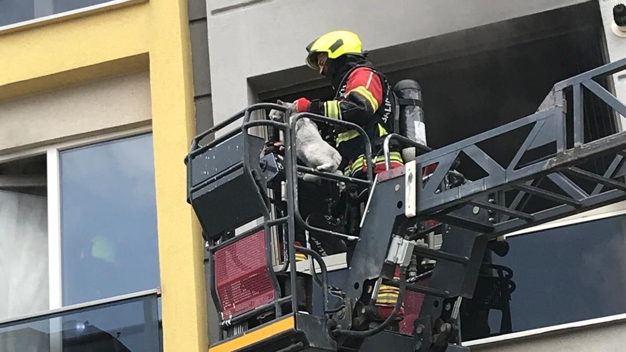 Dumandan etkilenen dairede arama yapan ekipler, içeride mahsur kalan evcil kediyi fark etti. Hızlı bir planlama ile merdiven aracı devreye alınarak kedi güvenle dışarı çıkarıldı.
