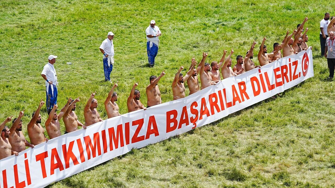 Baş boyunda güreşecek pehlivanlar, seyirciye takdim edildi, pehlivanlar aynı zamanda "A Milli Takımımıza başarılar dileriz" pankartı da açtı. Bu sırada güreşecek tüm başpehlivanlar, "bozkurt" işareti yaptı.