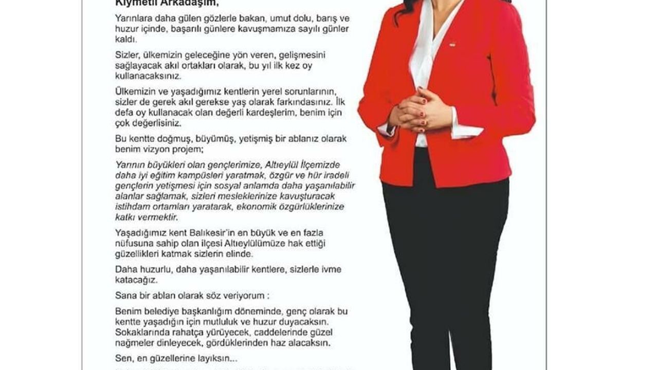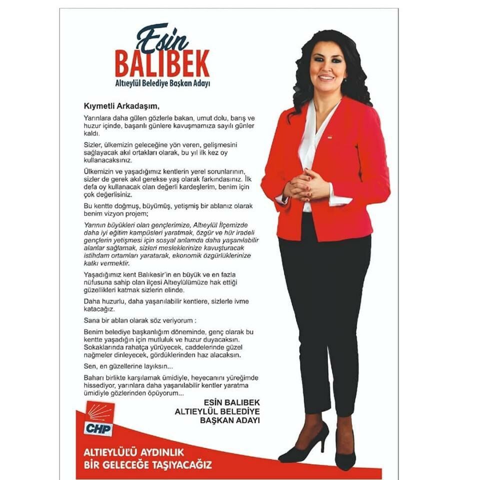 Altıeylül Belediye Başkan adayı Esin Balıbek, 31 Mart seçimlerinde ilk kez oy kullanacak gençlere mektupla ulaştı.