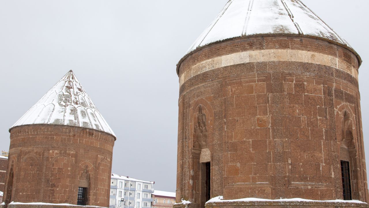 Bitlis’te etkili olan kar yağışı, Ahlat ilçesindeki tarihi yapıları beyaza bürüdü.
