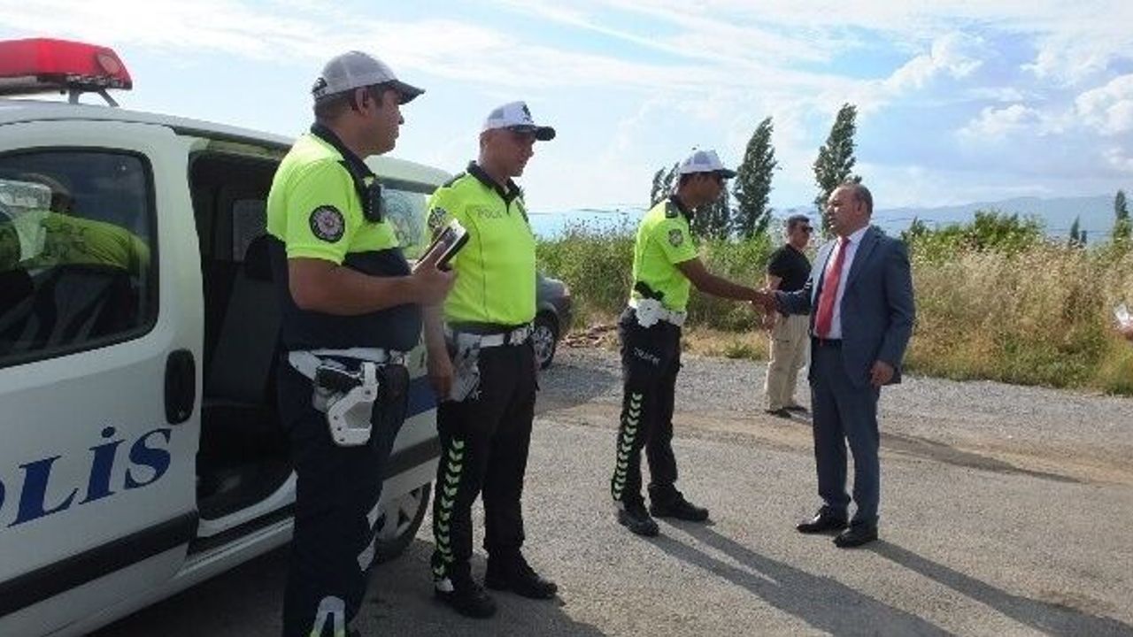 Çanakkale-İzmir Karayolunda yapılan denetime katılan Burhaniye Kaymakamı Hüseyin Öner, sürücülere uyarılarda bulunurken, bayramlarını kutladı ve çocuklara kırmızı düdük hediye etti.