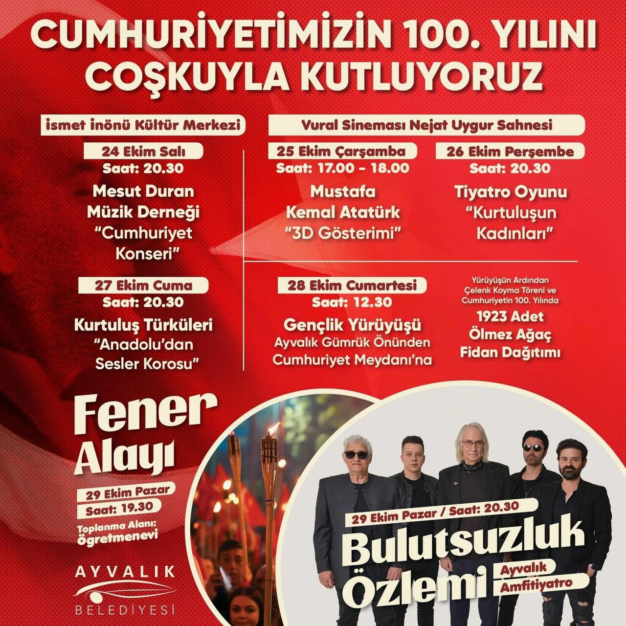 Ayvalık Belediyesi, Cumhuriyet’in 100. kuruluş yıldönümünü Atatürk Türkiye’sine yakışır törenlerle kutlamaya hazırlanıyor. Cumhuriyet Bayramı coşkusu hafta boyunca Ayvalık’ta sokaklardan meydanlara, salonlardan stadyumlara kadar, ilçenin her noktasında doyasıya yaşanacak.24 Ekim Salı Saat:20.30’da İsmet İnönü Kültür Merkezinde Mesut Duran Müzik Derneği’nin Cumhuriyet Konseri ile başlayacak olan etkinlikler, 25 Ekim Çarşamba Saat:17’de Vural Sineması Nejat Uygur Sahnesi’nde Mustafa Kemal Atatürk 3 Boyutlu Gösterimi ile 25 Ekim Perşembe Saat:20.30’da Vural Sineması Nejat Uygur Sahnesi’nde Kurtuluşun Kadınları Tiyatro Oyunu, 27 Ekim Cuma Saat:20.30’da İsmet İnönü Kültür Merkezinde Anadolu’dan Sesler Korosu Kurtuluş Türküleri ile her akşam doyasıya yaşanacak.28 Ekim Cumartesi Saat:12.30’da Gençlik Yürüyüşü Ayvalık Gümrük Önünden Cumhuriyet Meydanına gerçekleştirilecek yürüyüşün ardından Atatürk Anıtı’na çelenk sunulması ve ardından 1923 adet Ölmez Ağaç Zeytin Fidanı Dağıtımı gerçekleştirilecek.Ve 29 Ekim Pazar saat 19.30’da Öğretmenevinden Cumhuriyet Meydanı’na Fener Alayı ardından saat 20.30’da Ayvalık Belediyesi Amfitiyatro’da 100. Yıl Bulutsuzluk Özlemi Konseri ile kutlamalar son bulacak.Ayvalık Belediye Başkanı Mesut Ergin tüm vatandaşları Cumhuriyetin Yüzü Ayvalık’ta, Cumhuriyet’in 100. Yılı coşkusunu hep birlikte yaşamaya davet ediyor.